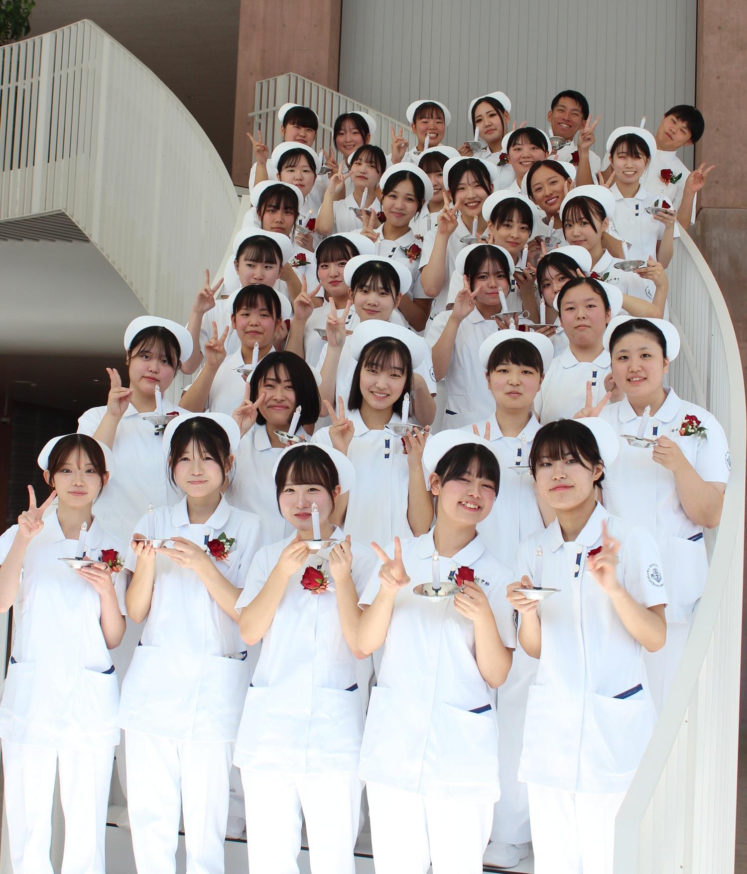 学生たちは、ケアの象徴であるナースキャップを教員から一人ひとり授けられ、さらにケアの精神を受け継ぐ象徴である蝋燭に灯をともすことで、医療人として歩み始める決意を新たに一歩を踏み出しました。