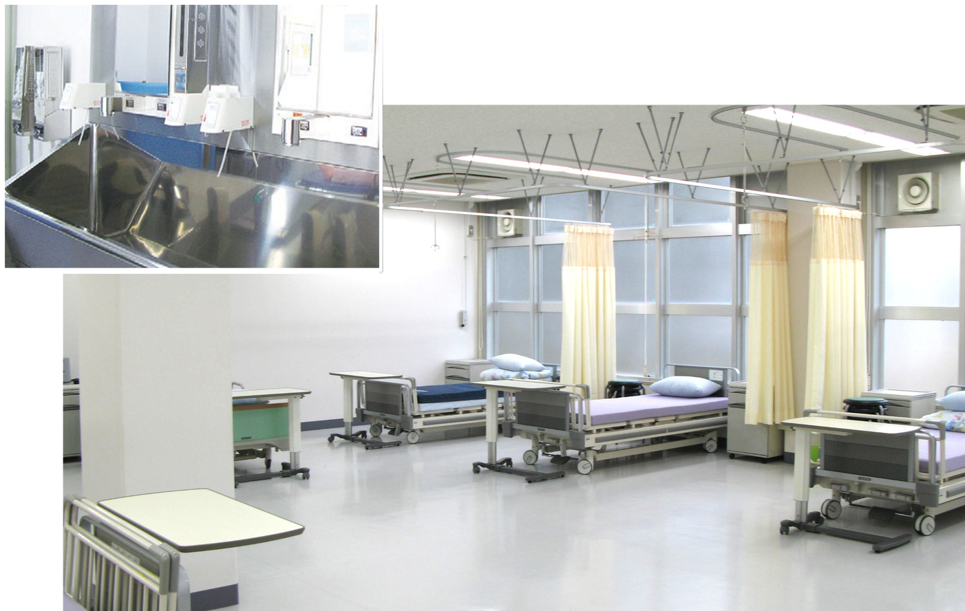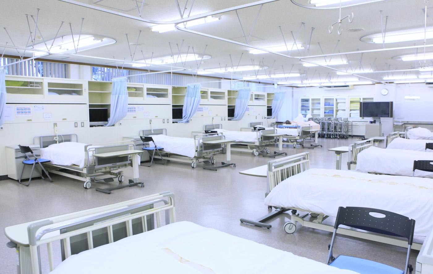 救急場面に関する実習や高齢者体験を通した食事や排泄等に関する実習を行います。基礎看護学実習室とは異なり、電動ベッド、床ずれ予防のための体圧分散用マットレス等も入っており、高齢者モデル人形等を使用して演習を行います。手術用手洗いがあるのも特徴の一つです。