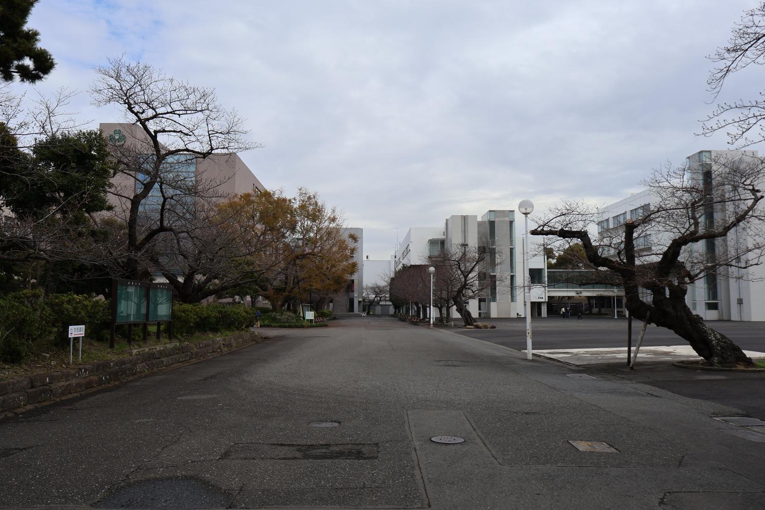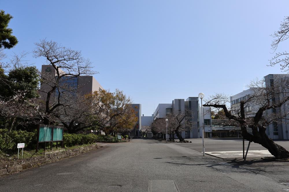 本学の敷地は、以前は海軍機関学校(後の海軍工機学校)があり、この桜並木は米海軍基地側から本学、そして海に向かって連なり、機関学校時代から約100年続く桜並木通りとなっております。