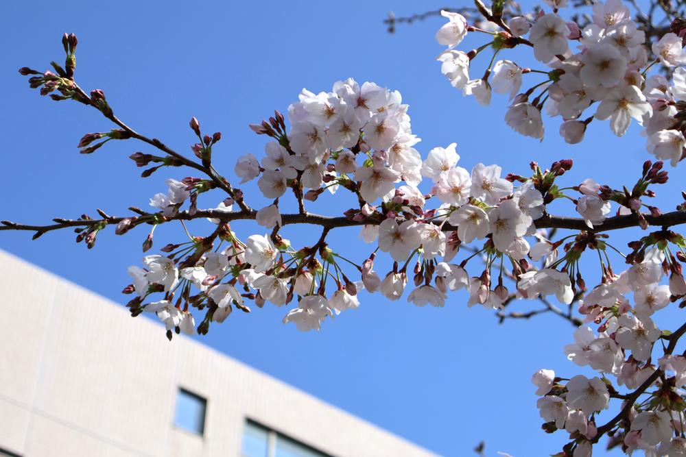 3月23日の開花のご報告から4日が経過しました。ここ数日の暖かな陽気に誘われて、キャンパス内の桜は少しずつ花数を増やしています。現在は「三分咲き」ほどです。