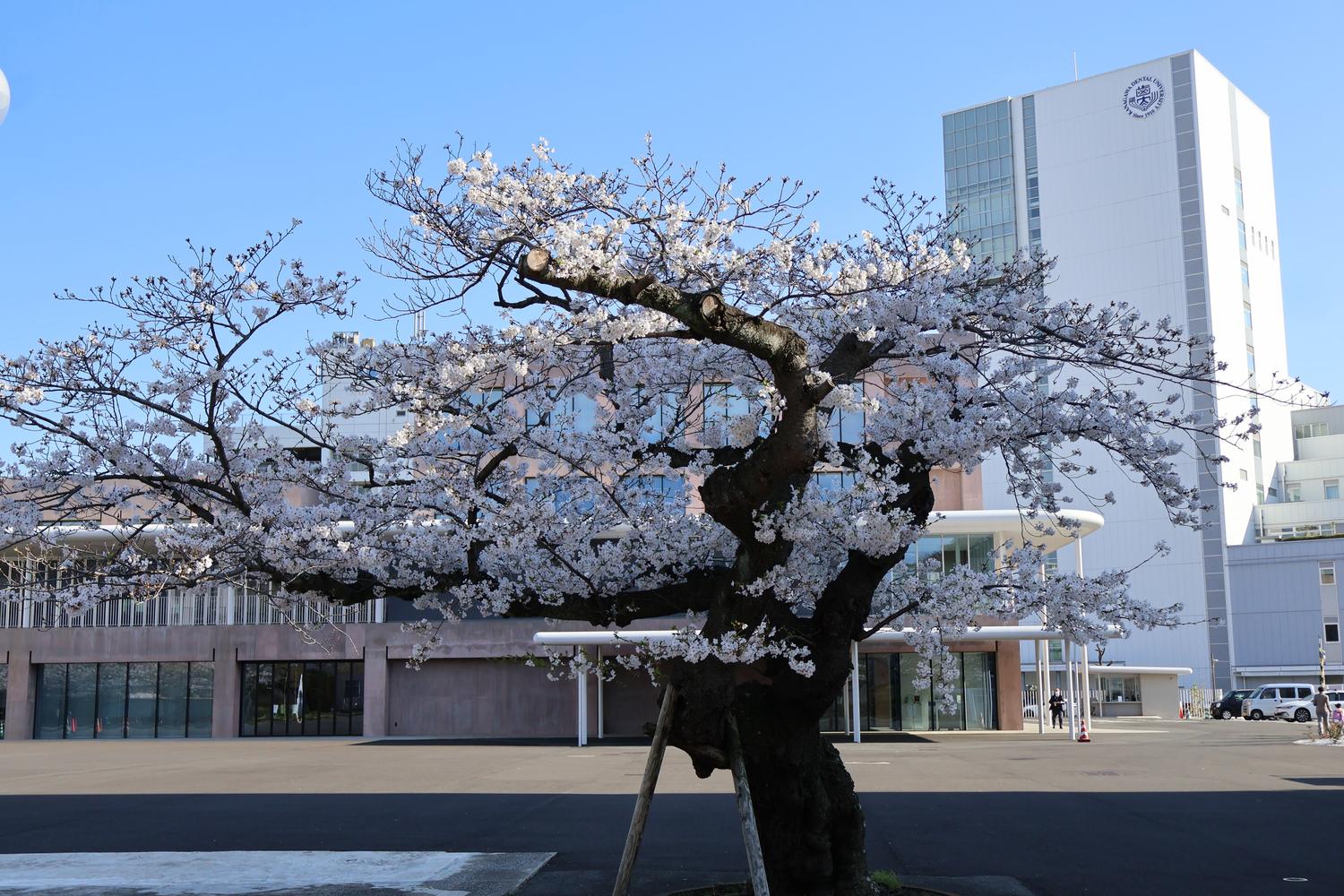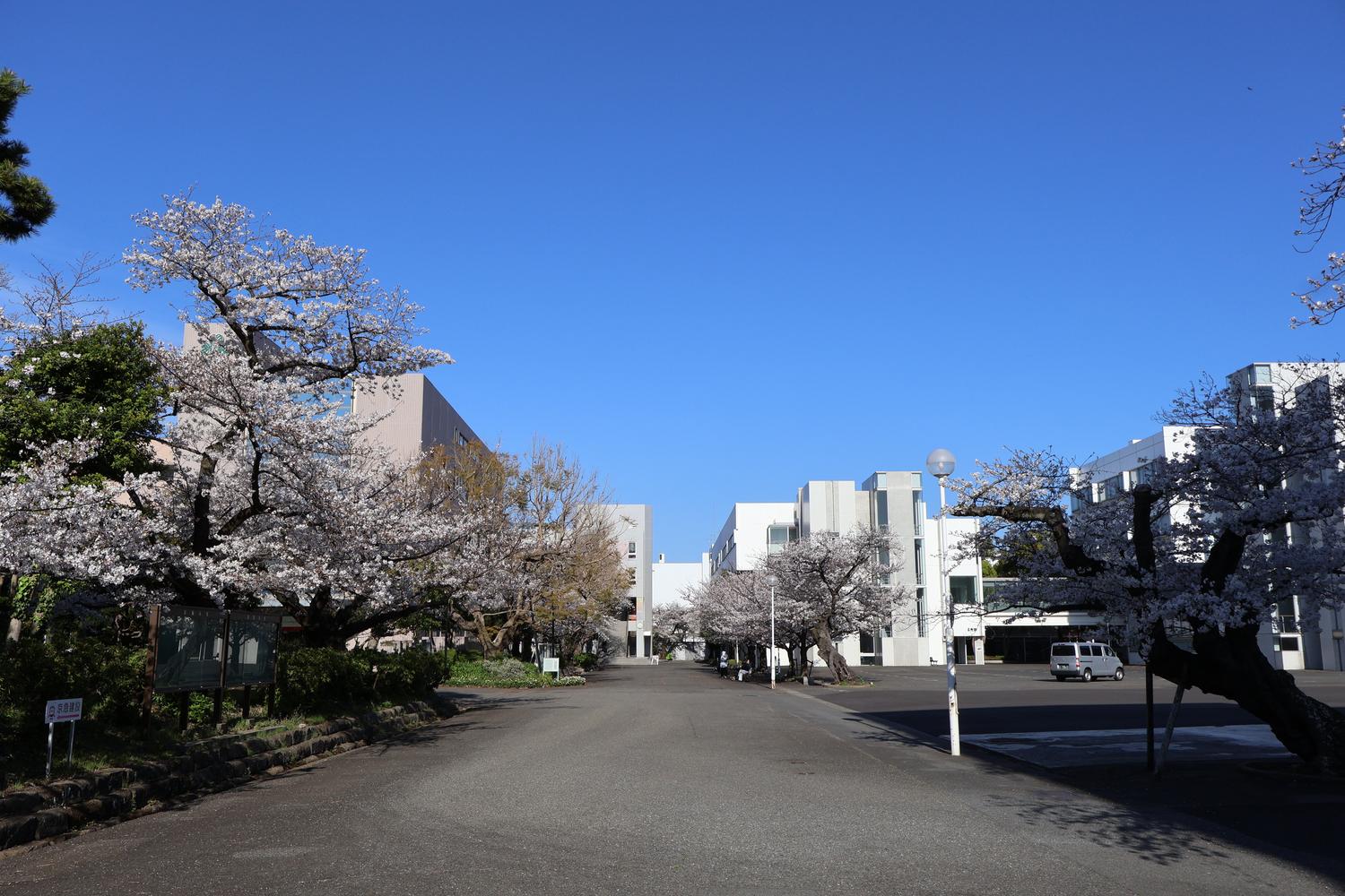 昨日までの雨も上がり、本日は雲ひとつない見事な快晴に恵まれ、学内の桜も「満開」の見頃を迎えました。