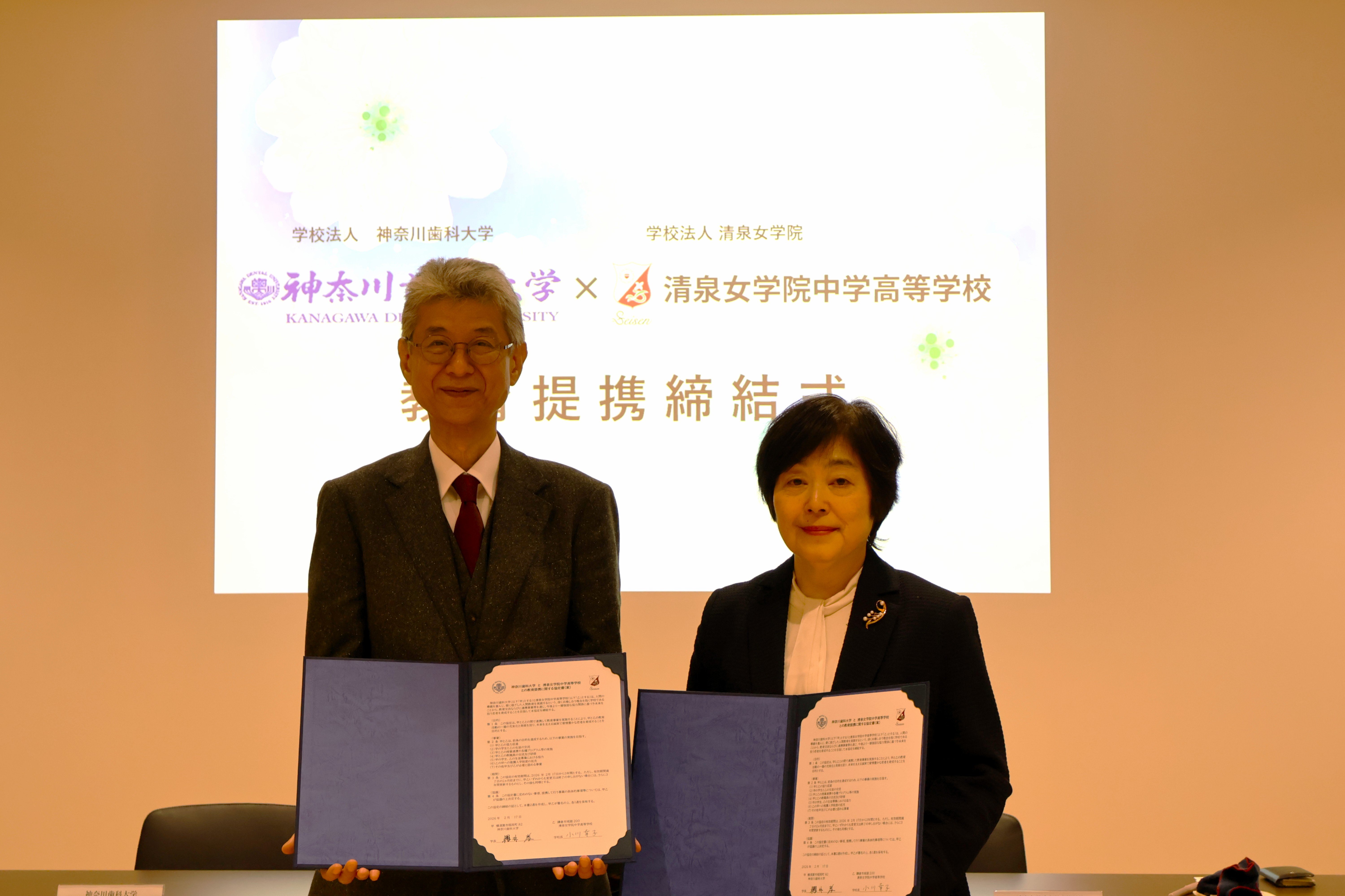 本学と清泉女学院中学高等学校は、共に"愛に根ざした人間教育"という共通の理念を掲げ、これまでも教育交流や連携事業を重ねてまいりました。こうした歩みをさらに発展させ、未来を担う若者の育成に係る協力体制を今後一層強化すべく、このたび連携協定を締結いたしました。本学の敷地は、かつては清泉女学院の小・中・高・大学が置かれていた場所であり、その移設後に本学が設立され、横須賀での歴史が始まった、という深いご縁があります。さらに2022年には、本学キャンパス中央に清泉女学院様の記念碑も建立され、今回の協定はまさに長く待ち望まれていたものと言えます。