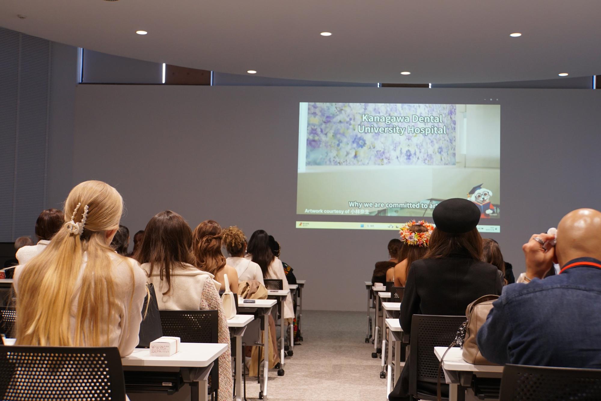 歓迎セレモニーには多くの教職員が参列し、鹿島理事長による英語でのスピーチに続いて、本学紹介の英語版動画(AI編集)をご覧いただきました。