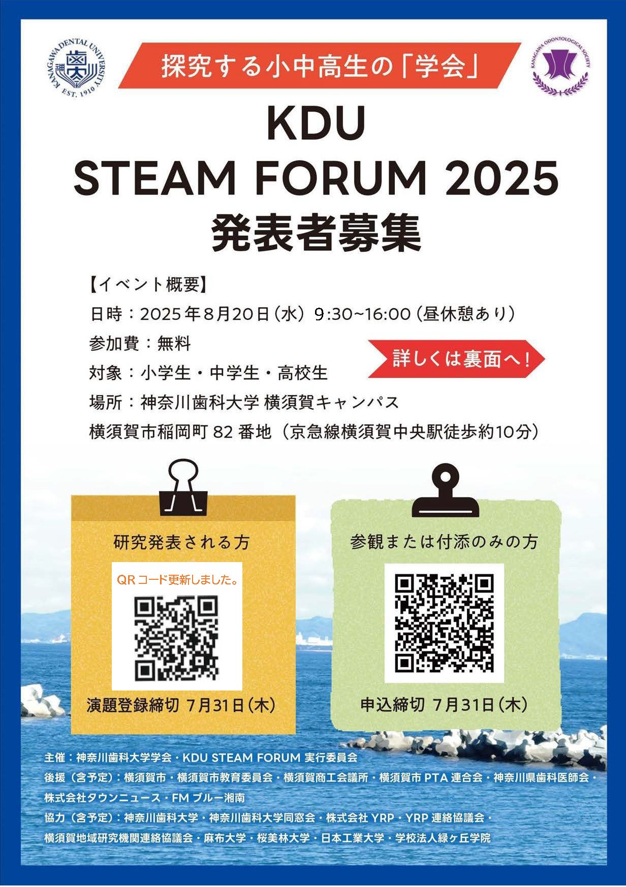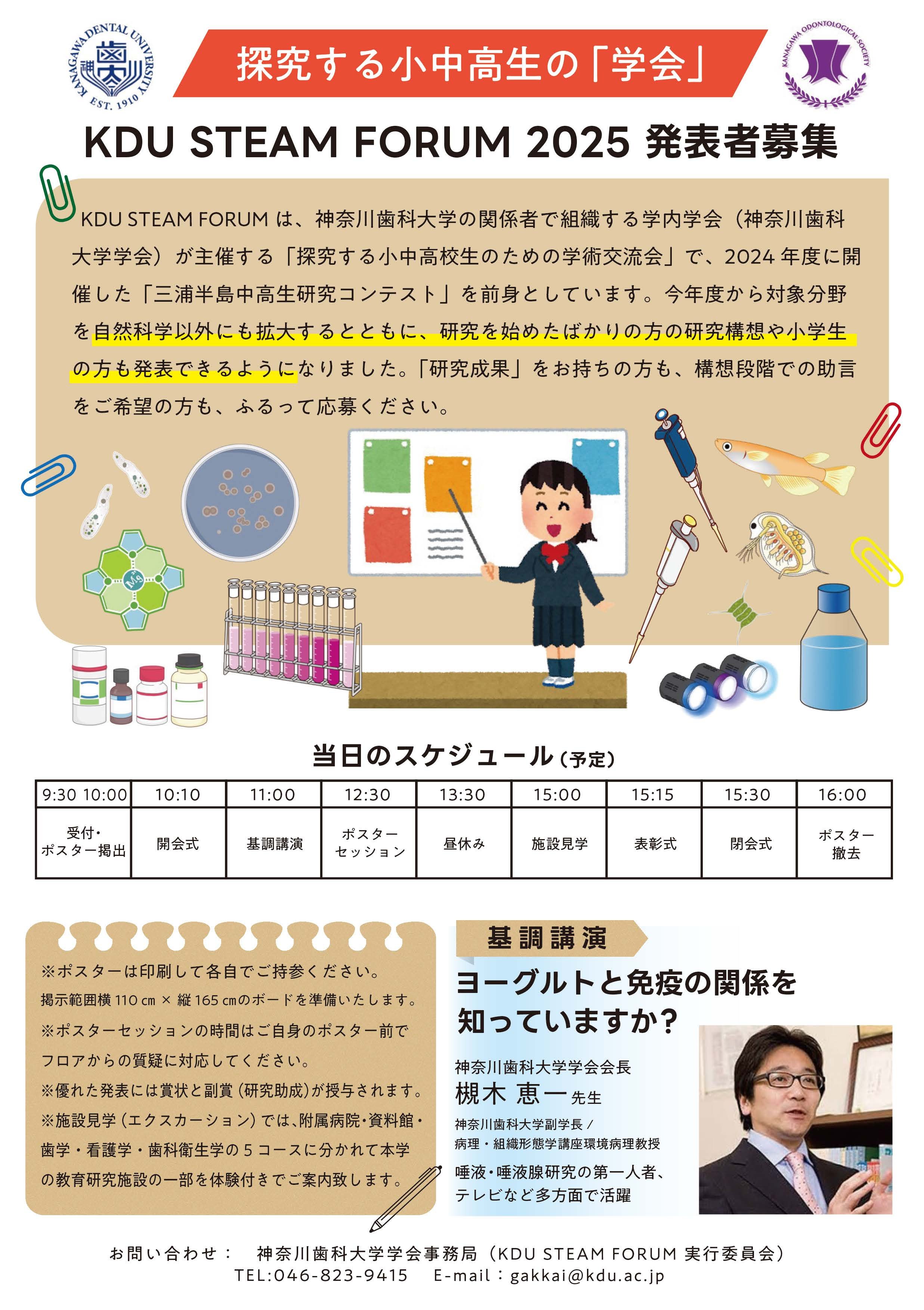 神奈川歯科大学学会では、「KDU STEAM FORUM 2025」にて発表する小・中・高校生の発表者を募集しています。本学キャンパスでご自身の研究成果を大学の先生たちに発表してみませんか。ご応募お待ちしています!