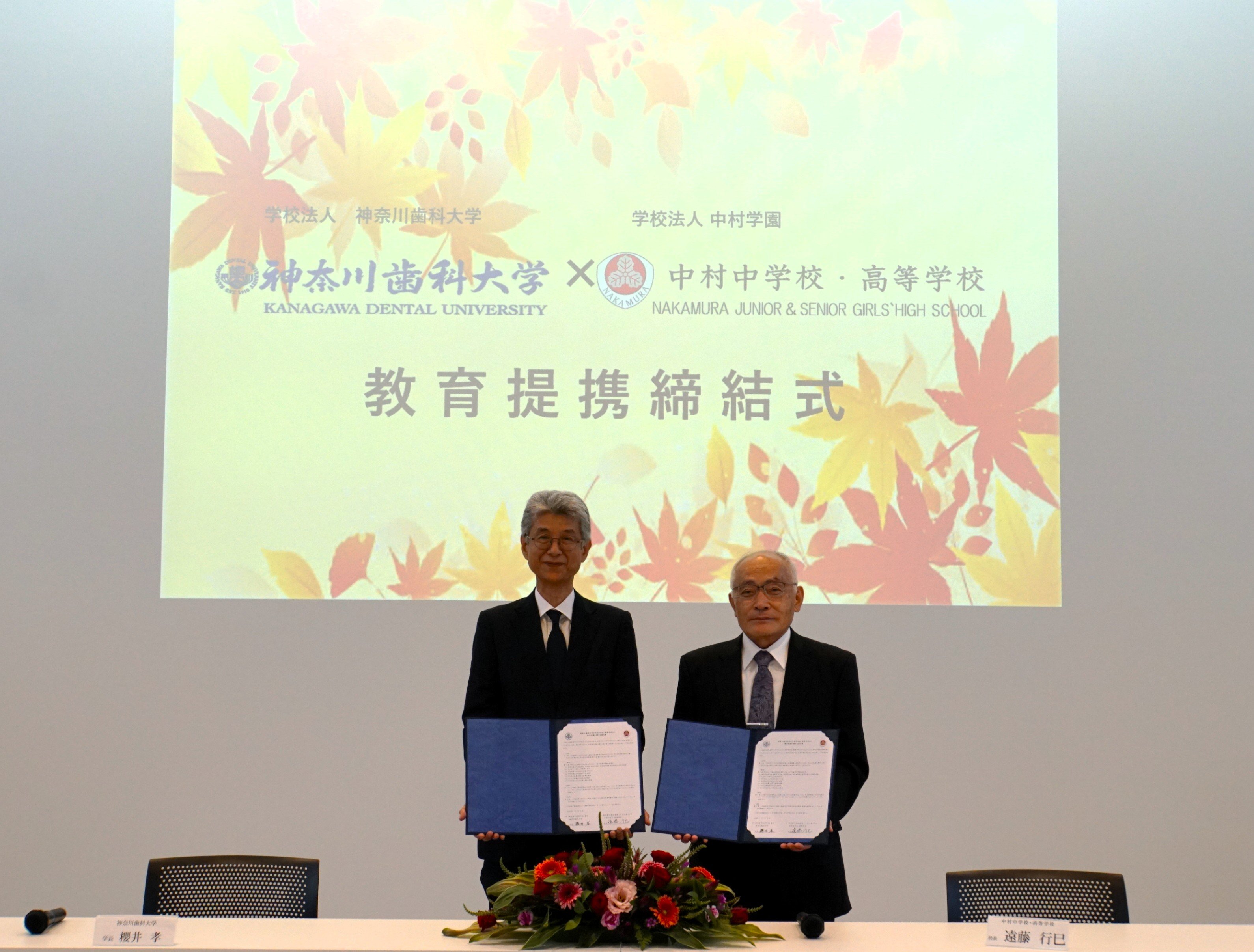 秋の風情が感じられる中、式では校長の遠藤行巳先生より「歯科医療に触れる機会が少ない生徒にとって、実りある締結となります。同時期の創立であることにご縁を感じつつ、この連携が長く続く事を祈っております」とご挨拶くださりました。櫻井学長からは「本学が提供する教育リソースを、医療探究活動に加え保健体育など様々な形で利用して頂き、中等教育期間に大学での教育期間を加えた12年間をかけて、未来に羽ばたく若者を育み、社会へと送り出すことができれば嬉しい限りです」との抱負が語られました。