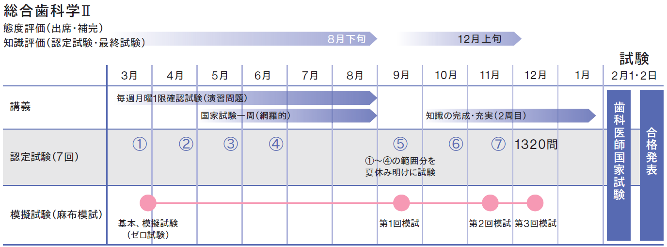 5年次の「臨床実習」と6年次の「総合歯科学Ⅱ」の連携を強めた、体系的なカリキュラムを構築。試験対策指導に関する経験豊かな教員が過去問を徹底的に分析し、授業内容を組み立てています。6年次には7回の認定試験を学生に課し、弱点を明確にすることで、確実なスキルアップに。学生たちがこれまでの5Stage制で学修スタイルを身につけたからこそ、実行できるカリキュラムです。